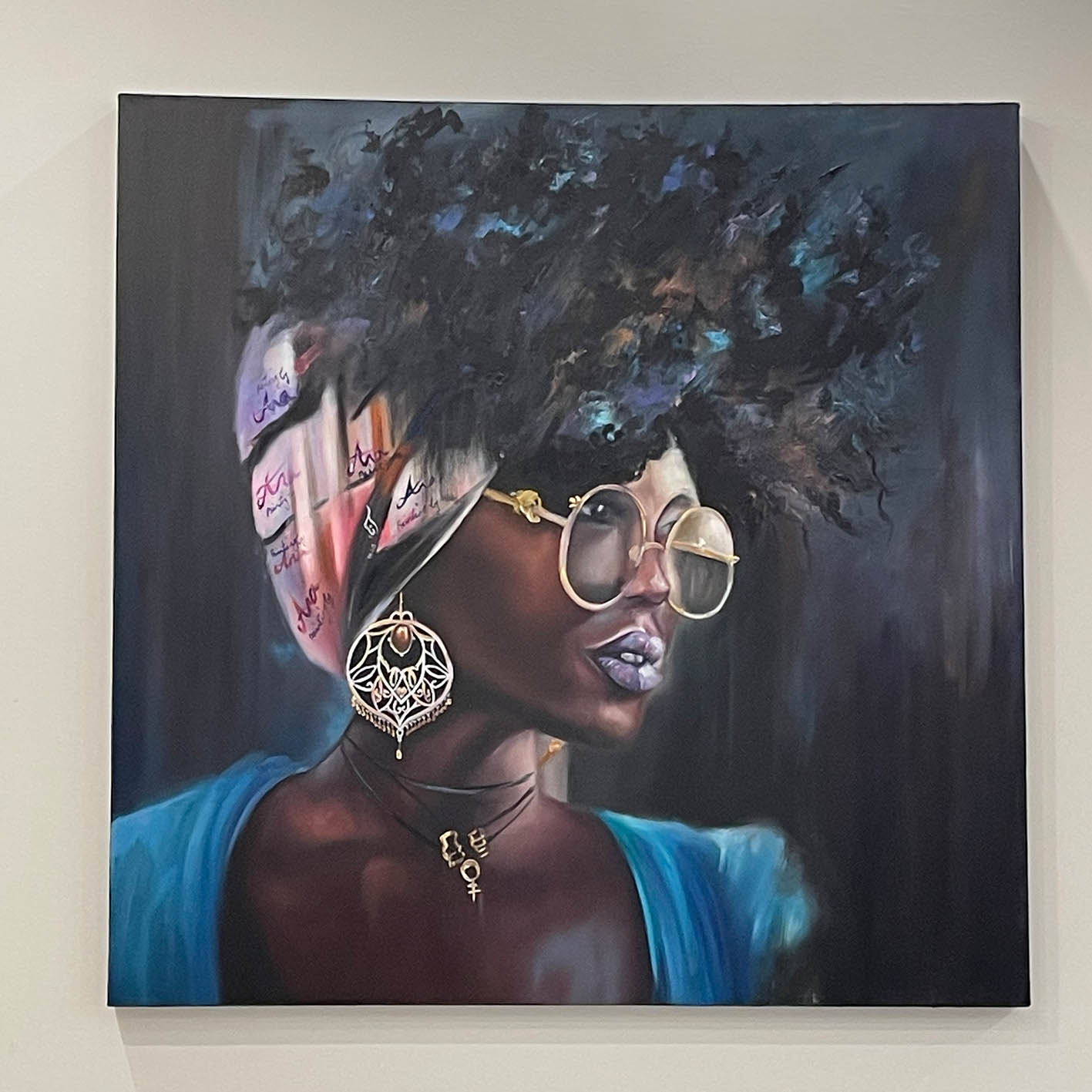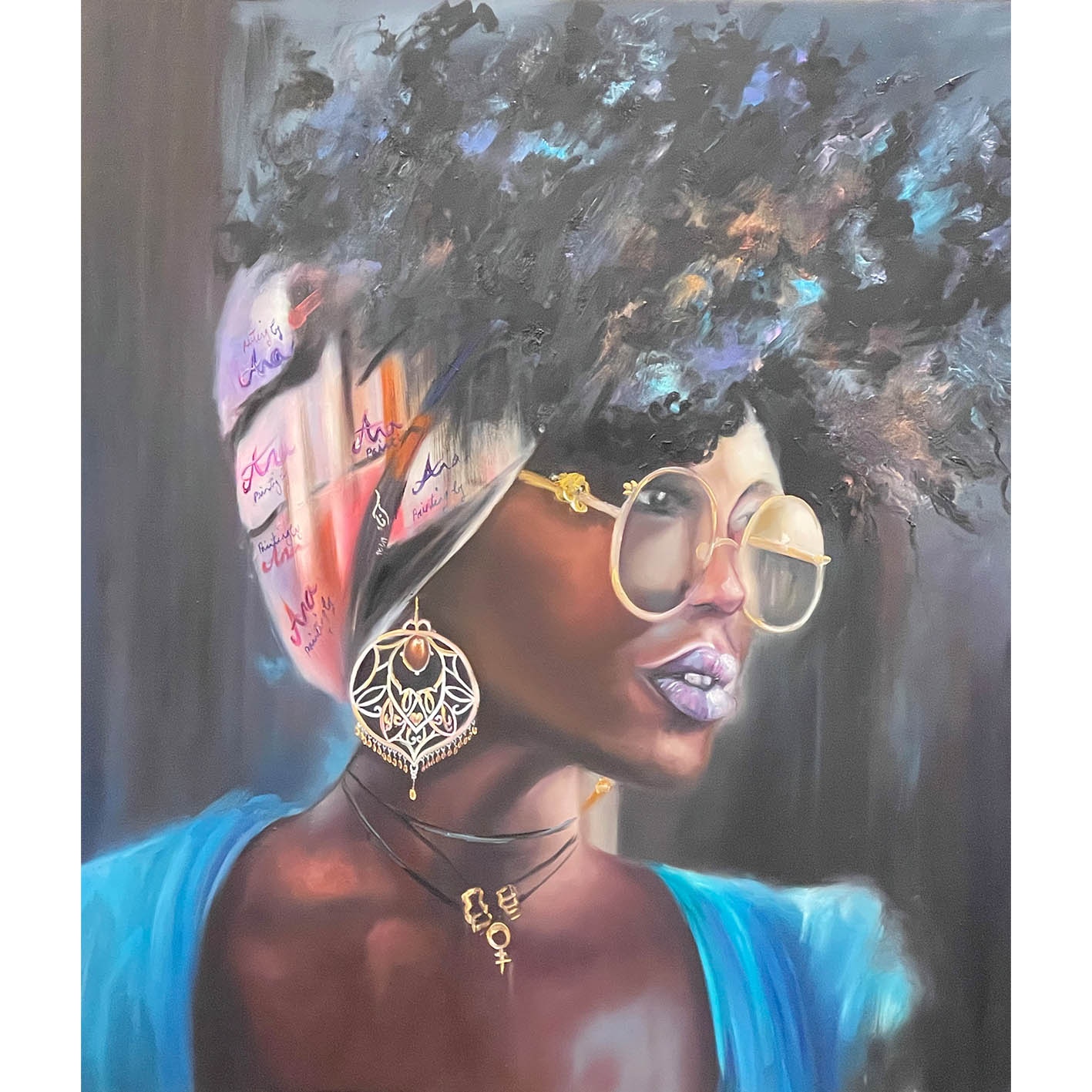 Eine Frau mit dunkler Haut, violetten Lippen, übergroßer Brille und einem kunstvoll beschrifteten Tuch schaut in die Ferne – nicht, um gesehen oder bestätigt zu werden, sondern weil sie weiß, wer sie ist und wohin sie geht.